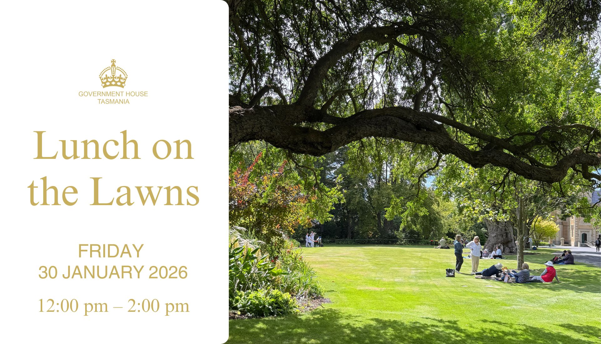 Summer has well and truly arrived at Government House, so we hope you can join us for Lunch on the Lawns on Friday 30 January from 12:00 pm to 2:00 pm.