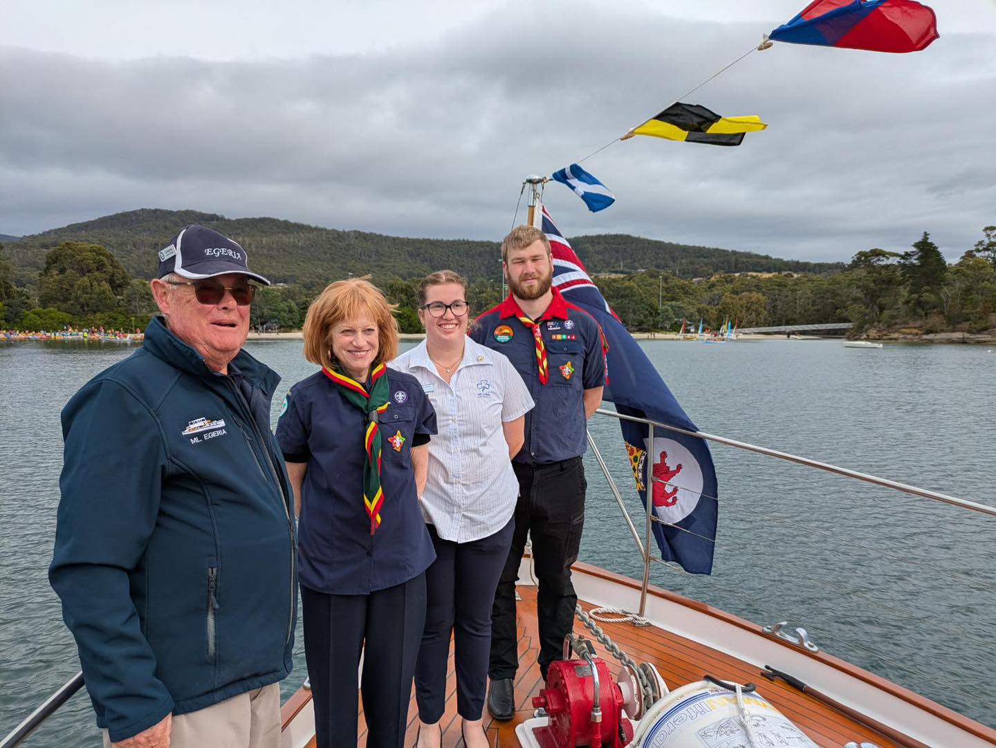 In the morning at Snug Beach, the Governor of Tasmania, the Honourable Barbara Baker, accompanied by Emeritus Professor Don Chalmers, delivered an address to officially open the 61st Scout Guide Regatta.