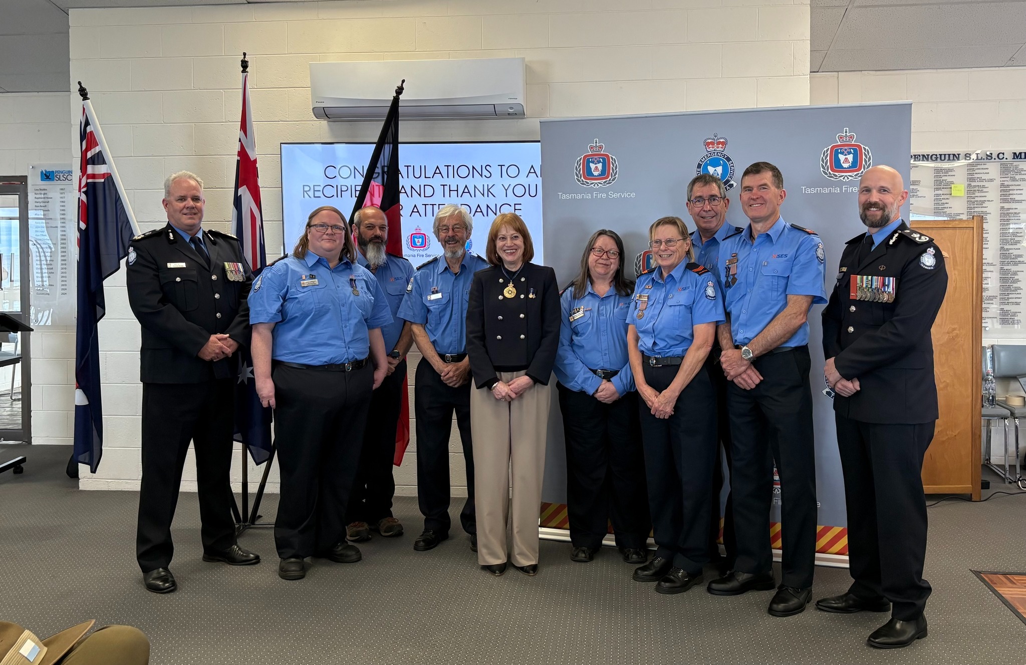 In the morning at the Penguin Surf Lifesaving Club, the Governor of Tasmania, the Honourable Barbara Baker, accompanied by Emeritus Professor Don Chalmers, presented recipients with National Medals at a ceremony hosted by the North-West Region of the Tasmania Fire Service.
