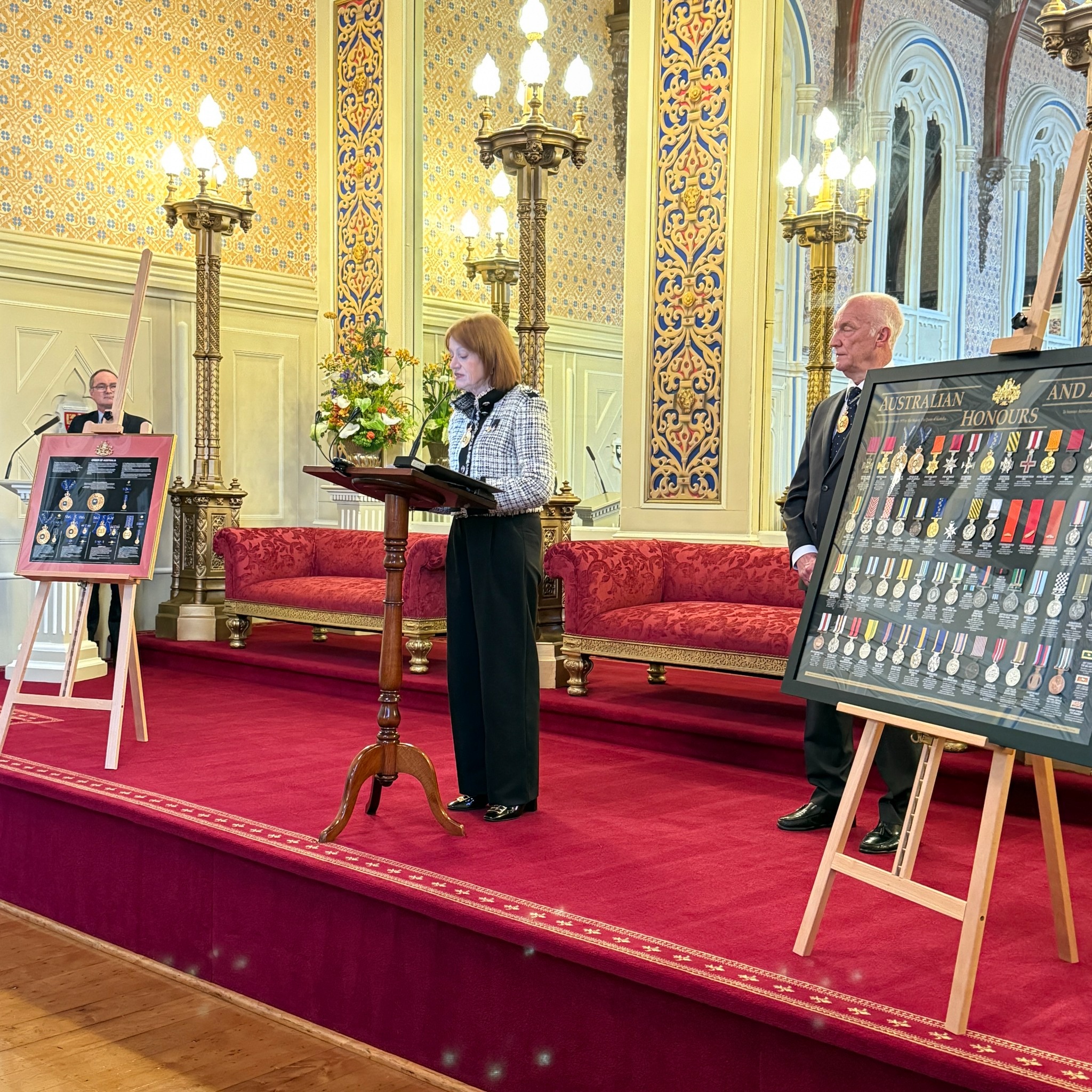 On display at the reception were Australian Honours and Awards insignia, including replicas of the medals for the system’s founding awards designed by specialist gold and silversmith Stuart Devlin AO CMG (1931-2018).